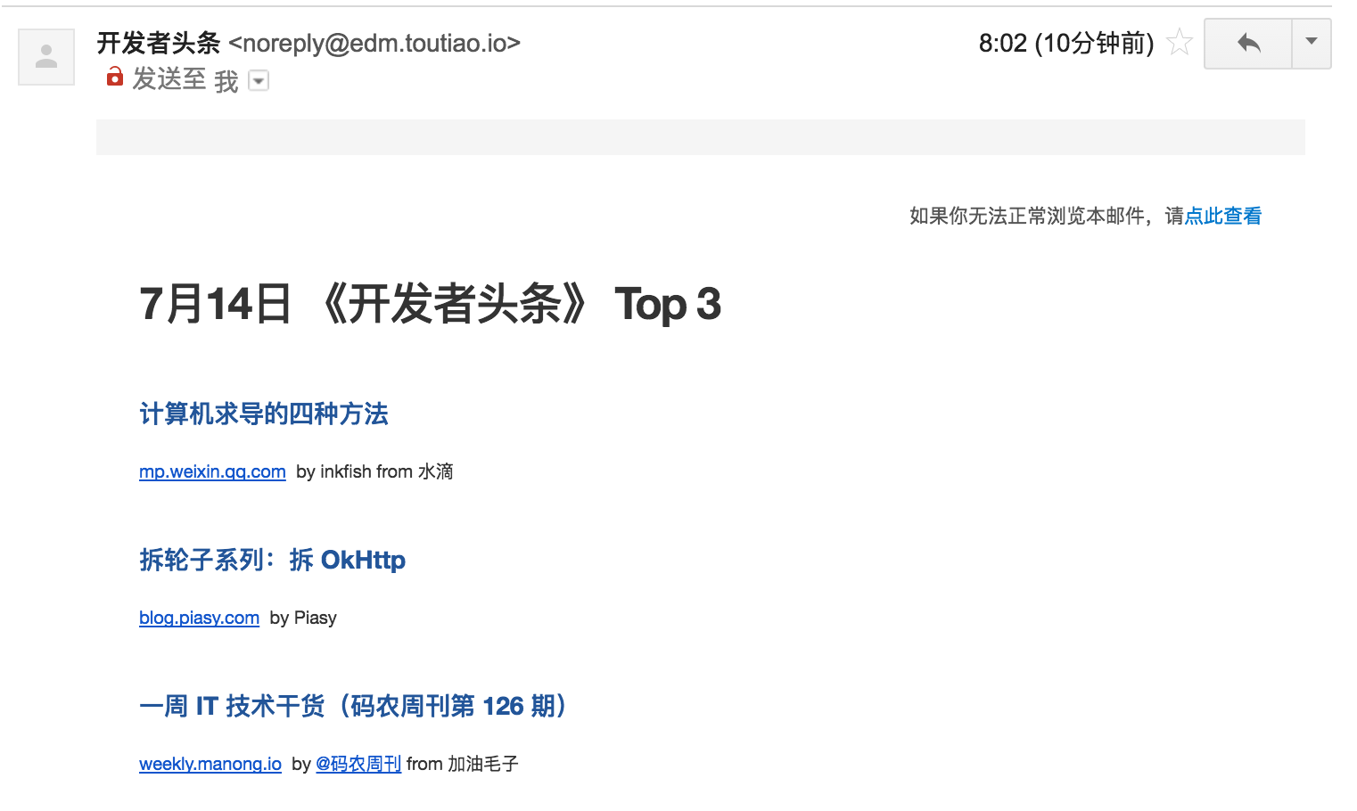 2016 年 7 月 14 号,文章 拆轮子系列:拆 OkHttp 登上 开发者头条榜首,成就文章被开发者头条邮件推送达成